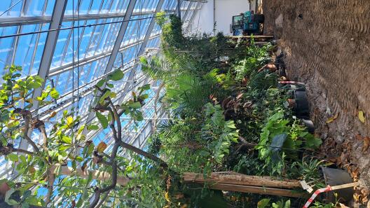 In den vergangenen Wochen wurden sämtlich Pflanzen vorsichtig aus dem großen Tropenhaus entfernt und sind in Töpfen provisorisch in anderen Gewächshäusern untergebracht worden oder ins Freiland gestellt worden. Die Palmfarne und die Würgefeige konnten aufgrund ihres Alters und ihrer Größe nicht getopft werden. Sie verbleiben während der Bauarbeiten im Tropenhaus.
