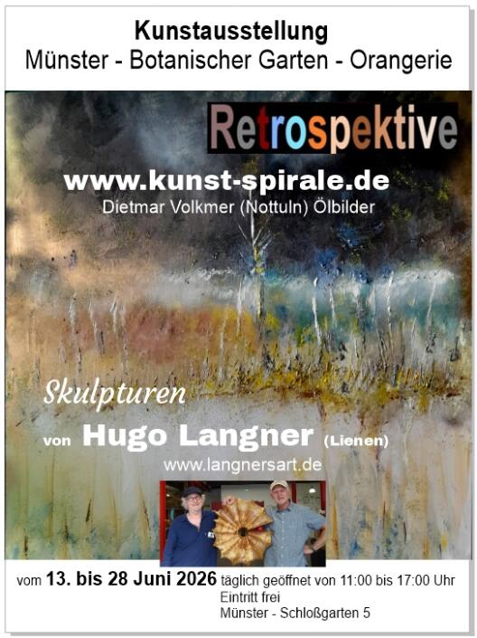 Der Künstler Hugo Langner (Lienen, Tecklenburger Land) präsentiert einige seiner Skulpturen. Die oft mit Holz (Schichten) entstandenen Werke entstehen aus innerer Kraft, oft zu aktuellen kulturellen und menschlichen Hintergründen.