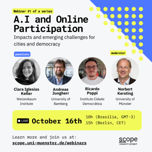 Die Auftaktveranstaltung findet am 16. Oktober um 15:00 Uhr (MESZ)/10:00 Uhr (BRT) statt und konzentriert sich auf das Thema „Künstliche Intelligenz und Online Partizipation“. Diese widmet sich den Herausforderungen und Möglichkeiten von künstlich intelligenter Steuerung in demokratisch orientierten Smart City-Initiativen. Moderator dieser ersten Podiumsdiskussion ist Prof. Dr. Norbert Kersting. Am Panel beteiligen sich zudem Herr Ricardo Poppi, Geschäftsführer des Instituto Cidade Democrática, Frau Clara Iglesias Keller, Leiterin der Forschungsgruppe "Technologie, Macht und Dominanz" am Weizenbaum-Institut, und Herr Prof. Dr. Andreas Jungherr, Professor für Politikwissenschaft, insbesondere digitale Transformation an der Universität Bamberg.