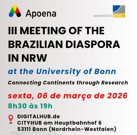 Das Netzwerk brasilianischer Forscher*innen in Deutschland, APOENA, lädt am 06. März 2026 an der Universität Bonn zum 3. Treffen der brasilianischen Diaspora für Wissenschaft und Innovation in NRW ein. Bei der Veranstaltung haben brasilianische Forschende aller Fachrichtungen die Möglichkeit, sich auszutauschen, zu vernetzen und Brücken zwischen Deutschland und Brasilien zu bauen.