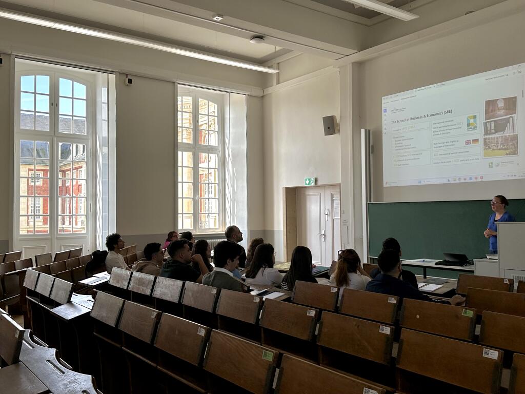Em seguida, o grupo aprendeu mais sobre a School of Business & Economics, um dos seus maiores pontos de interesse academico, apresentada por Olga Lunina e, por fim, sobre o próprio Centro Brasileiro, suas funções e seus objetivos, além da cooperação diversa e extensa cooperação com o Brasil; que foi apresentado pela sua Diretora Executiva e pela Diretora do Escritório de Representação do Centro Brasileiro em São Paulo, Laura Redondo. Após a calorosa recepção, os visitantes realizaram em um tour pelos edifícios da universidade e almoçaram no restaurante Universitário Mensa am Aasee.
