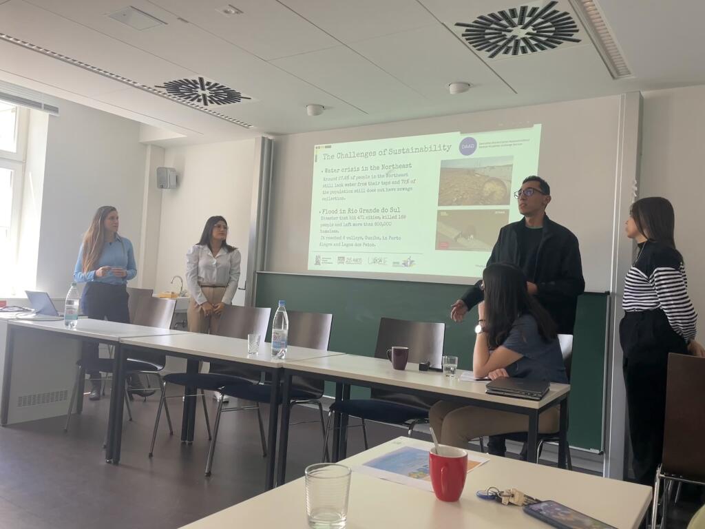 Após a pausa do almoço, o grupo, já encantado por Münster na primavera, visitou o Sprachenzentrum (Centro de Línguas da Universidade de Münster), onde conheceu mais sobre esta instituição e suas oportunidades com a apresentação de Ayrton Chavez e Olga Gaudioso Sousona, e assistiu a uma apresentação do doutorando Sertan Eravci sobre o tema “Marketing e Sustentabilidade”. Em seguida, os estudantes brasileiros compartilharam informações sobre Recife e o estado de Pernambuco. Após as apresentações, em uma discussão mediada por Laura Redondo, foram debatidas questões culturais relacionadas a marketing e sustentabilidade.
