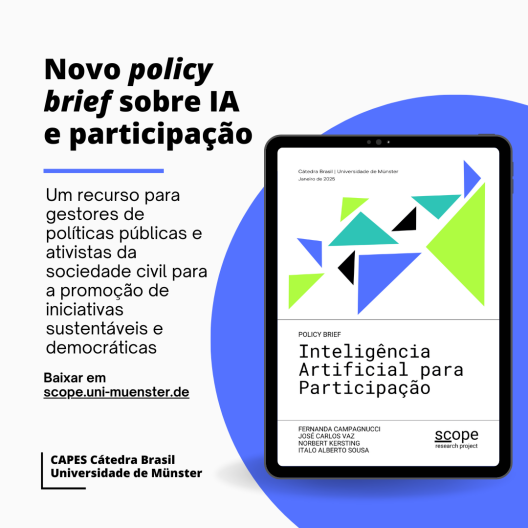 No âmbito do projeto “State Capacity for Online Participation in Smart Cities” (Scope), foi publicado o policy brief “Inteligência Artificial para Participação”. Esse relatório é o resultado do trabalho conjunto da equipe da Cátedra Brasil, composta pelo Prof. Dr. José Carlos Vaz, atual titular da Cátedra, pela Dra. Fernanda Campagnucci, pesquisadora de pós-doutorado, por Ítalo Alberto Sousa, doutorando, e pelo Prof. Dr. Norbert Kersting, professor anfitrião da equipe do no Instituto de Ciências Políticas (IfPol) da Universidade de Münster. A publicação foi possível graças ao apoio da CAPES e do Centro Brasileiro. A publicação se concentra na introdução e no impacto resultante da Inteligência Artificial (IA) na participação política e na governança democrática em contextos urbanos.