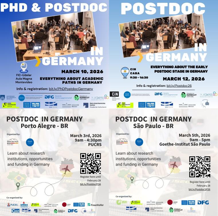 Em março de 2026 ocorrerão quatro sessões do workshop ”Postdoc in Germany” na América Latina: no Brasil, estão agendados eventos em Porto Alegre (03/03) e São Paulo (05/03). Outros eventos serão realizados em Montevideo, Uruguai (10/03), e em Buenos Aires, Argentina (12/03). Os eventos em Buenos Aires, São Paulo e Porto Alegre focam no nível do pós-doutorado, enquanto o evento informativo em Montevideo abrange tanto o nível de doutorado quanto o de pós-doutorado.