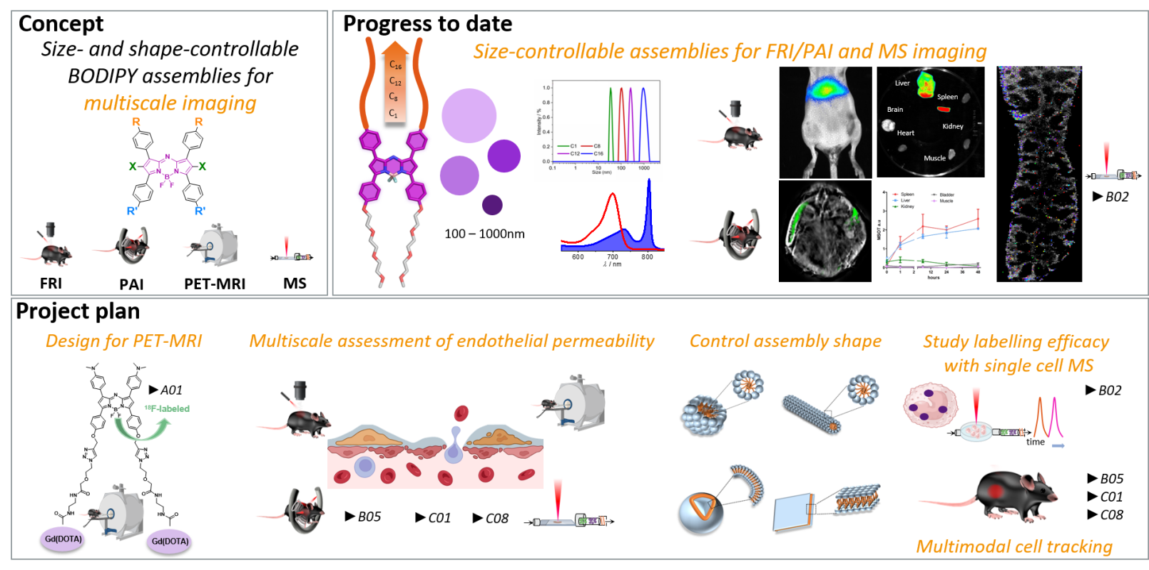 In the first funding period, we have developed size-controllable aza-BODIPY nanostructures for optical and photoacoustic imaging. We will now utilize these to expand the platform to PET-MRI and to multimodally study endothelial permeability in vivo in local and systemic inflammation. We also aim to modulate the shape of the aza-BODIPY assemblies to rationalize the relationship between molecular design, aggregate morphology and associated cell labelling efficacy. We will ultimately in vivo track aza-BODIPY-labelled monocytes in inflammatory diseases as well as to the tumour microenvironment in a murine cancer model.