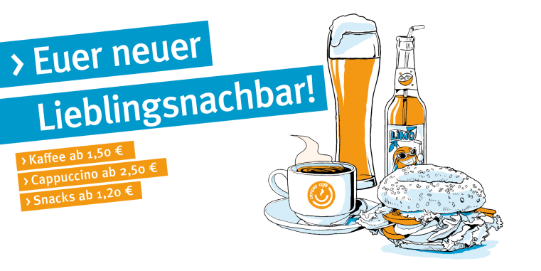 Wir bieten allerlei Kaffee- und Teevariationen, gekühlte Limo und Bier, kombiniert mit einer unserer Varianten an Kuchen und Kuluris - und das alles von unseren regionalen Lieferanten. Worauf wartest du noch? Wir sehen uns im Campus Café!