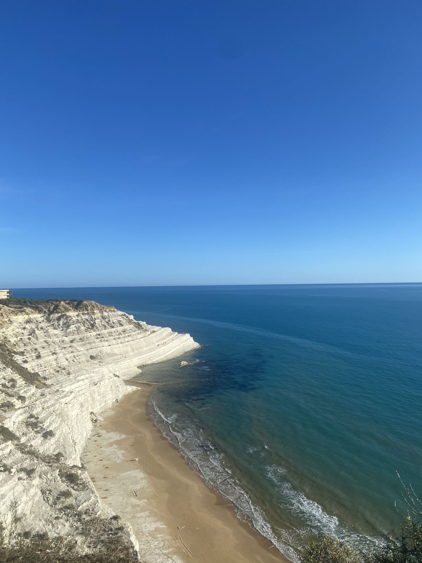 Am problematischsten ist jedoch die Situation der Wasserversorgung im Süden der Insel. Aufgrund der Wasserknappheit, lässt die Stadt das Wasser nur einmal in der Woche fließen. Während dieser Zeit füllen sich große Wassertanks, das Wasser darin muss dann für eine gesamte Woche reichen, was bedeutet, dass wir sehr sparsam damit umgehen müssen. Ich hätte nicht gedacht, dass die Auswirkungen des Klimawandels hier so allgegenwärtig sein würden und hoffe, dass sich die Situation in den Wintermonaten etwas entspannen wird. Die Landschaft ist entgegen meiner Erwartungen nicht trocken und vegetationsarm, sondern grün und schön anzusehen. Der schönste Strand in der Nähe ist der an der Scala dei Turchi, eine riesige weiße Kalksteinklippe (Abb. 3).