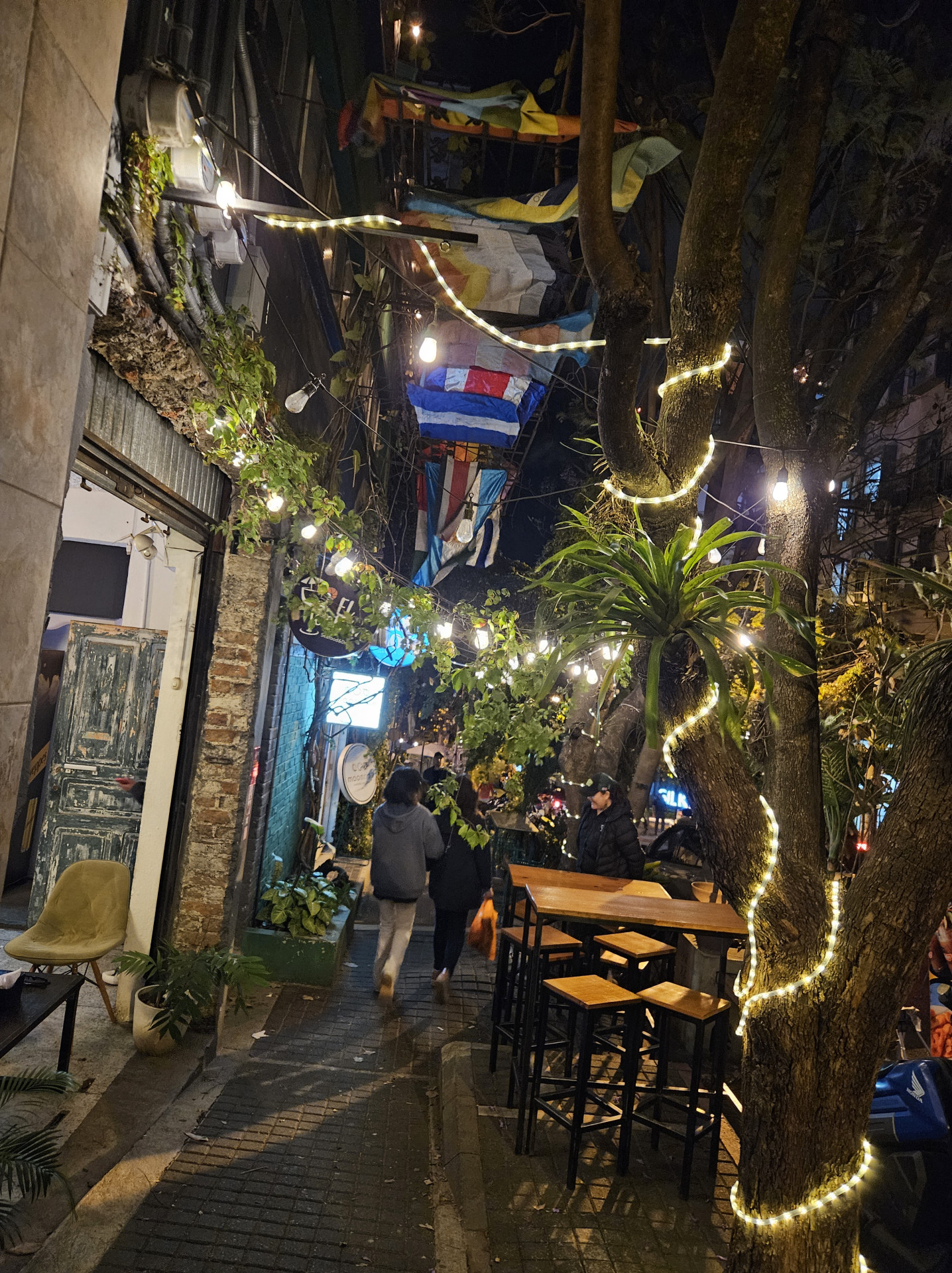 Eine Ecke weiter gibt es ein zwei bewachte Fußgängerstraßen, die durch Graffitis und nette Cafés