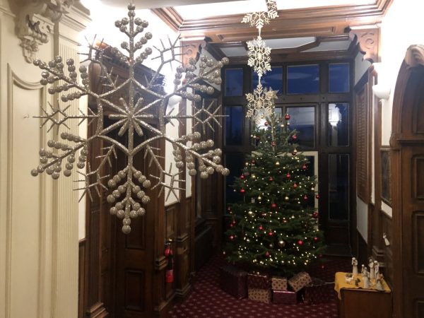 Weihnachten wurde hier in der letzten Schulwoche wirklich ausgiebig zelebriert, sowohl während der Schulzeit als auch im boarding house. Am Sonntag wurde nach einer gemeinsamen Runde Schlittschuhlaufen in Bath ein Wettbewerb zwischen den Jungen und Mädchen ausgetragen. Ziel war es, die eigene Etage im boarding house innerhalb einer Stunde weihnachtlich zu dekorieren. Drei Mal dürft ihr raten, wer nach tagelangem Basteln diesen Wettbewerb unter einstimmigem Juryurteil gewonnen hat. Am Montagabend stand dann das große Weihnachtsessen für boarders und boarding staff an, definitiv eines meiner Highlights des gesamten Praktikums. Dabei wurde ich in alle wichtigen englischen Weihnachtstraditionen eingeführt und verbrachte den Abend folglich im Weihnachtspulli und mit einer Papierkrone auf dem Kopf, die unverzichtbarer Bestandteil des englischen Christmas crackers ist. Nach dem von unserem Küchenteam liebevoll zubereiteten Drei-Gänge-Menü versammelten wir uns alle auf den Treppenstufen, um vorm Kamin gemeinsam Weihnachtslieder zu singen. Das klang unter anderem so: