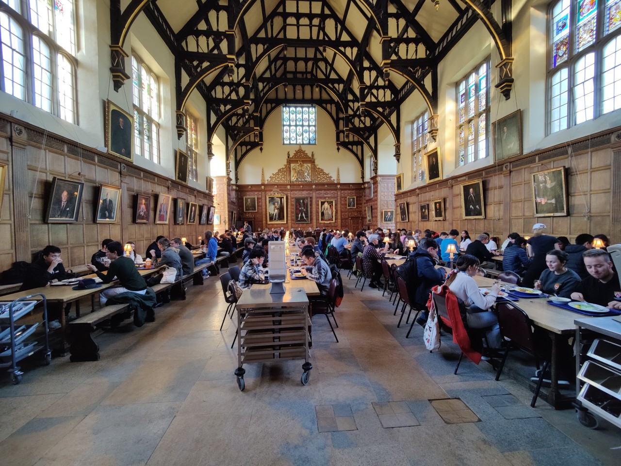 Wenn ihr schon dabei seid, fragt sie auf jeden Fall auch, ob sie euch auch mal zu einem Formal Dinner mitnehmen können. Dies sind schicke Dinner ,die mehrmals in der Woche gemacht werden und zu denen viele College-Mitglieder kommen. Das ist auf jeden Fall ein Erlebnis und da man oft an einer langen Tafel sitzt, erinnert es einen sehr stark an das Festmahl in der großen Halle in Hogwarts. Da die Karten für diese Formals schnell vergriffen sind, könnt ihr auch einfach wen fragen, ob er euch mit zum Mittagessen ins College mitnimmt. Im Bild unten ist ein Foto während eines ganz normalen Mittagessens im Trinity College zu sehen. Im gleichen Saal finden auch die Trinity Formals statt (leider habe ich hier kein Foto, da Smartphones beim Essen nicht immer gerne gesehen sind). Also kurz und knapp: Fragt Leute, ob sie euch ihr College zeigen und vielleicht mal zum Essen oder dergleichen mitnehmen.