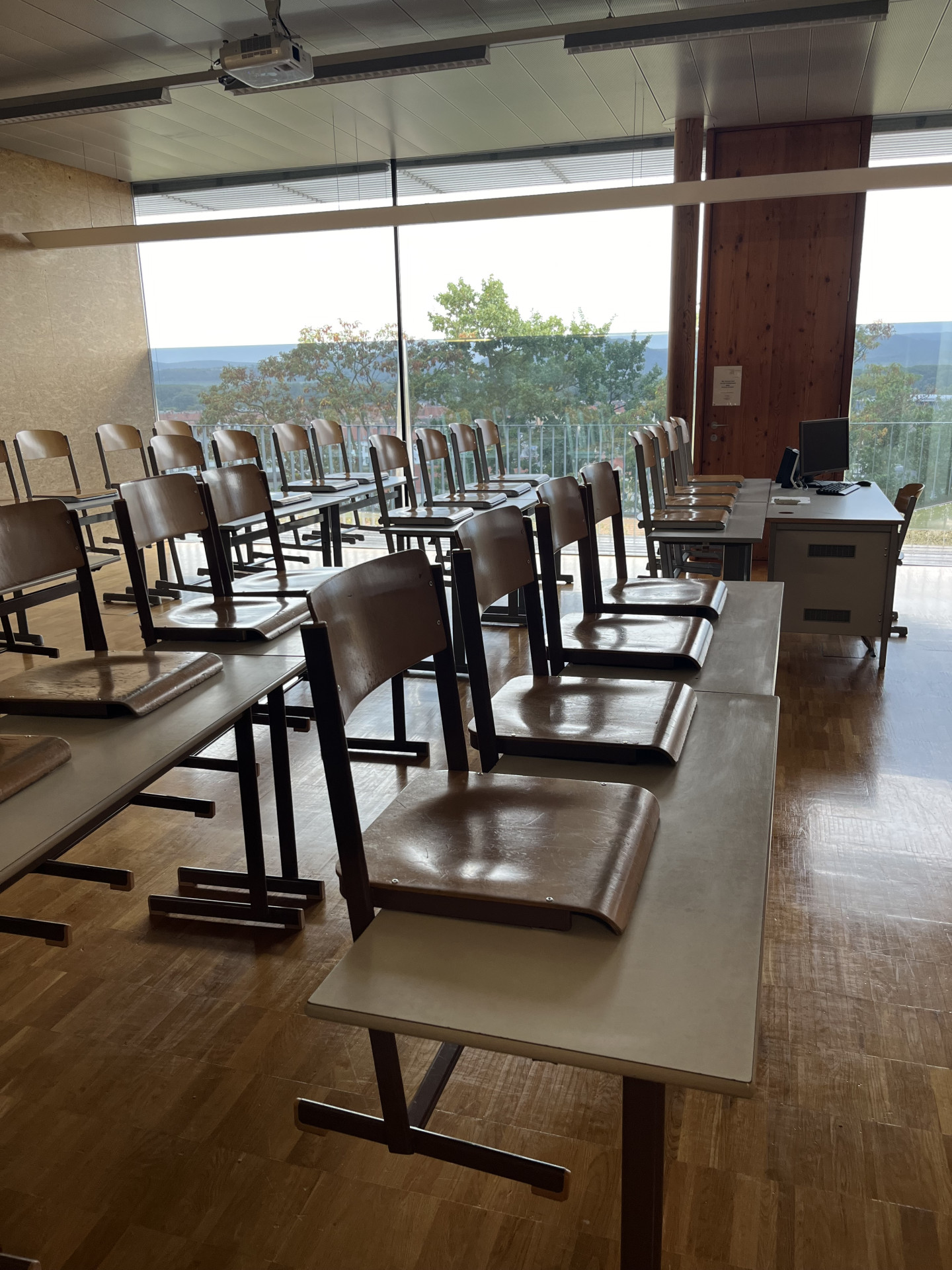 Um 7:30 Uhr starte ich meinen Tag an der HLF Krems. Nach meiner Ankunft richte ich mich im Lehrerzimmer an meinem eigenen Arbeitsplatz ein. Das Lehrerzimmer befindet sich im obersten Stockwerk der Schule und bietet einen fantastischen Ausblick über Krems und die umliegenden Weinberge.