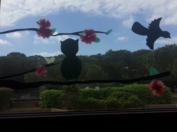 Ergebnisse meines Kunstunterrichts zum Thema “Frühling im Rom”: Die Äste am Klassenzimmerfenster wurden durch selbstgefaltete Blüten ergänzt.