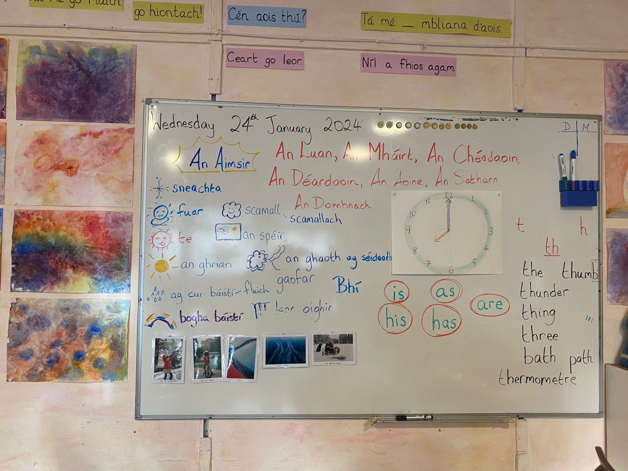 In der dritten und vierten Stunde wird normalerweise Irisch und Mathe unterrichtet. Im regulären Unterricht im Klassenraum lernen die Kinder je nach Thema beispielsweise Begriffe, die mit Weihnachten oder dem Wetter zu tun haben. Diese werden anschließend mündlich geübt, und oft folgt das Malen eines Bildes oder das Lesen einer Geschichte auf Irisch. Im Mathematikunterricht werden die Klassen gelegentlich getrennt, da die Erstklässler noch nicht so weit sind wie die Zweitklässler und daher mehr Zeit benötigen, um die Themen richtig zu verstehen.
