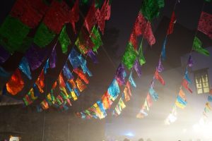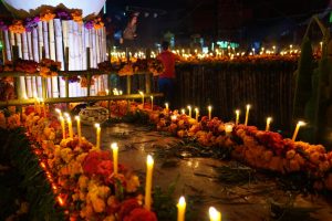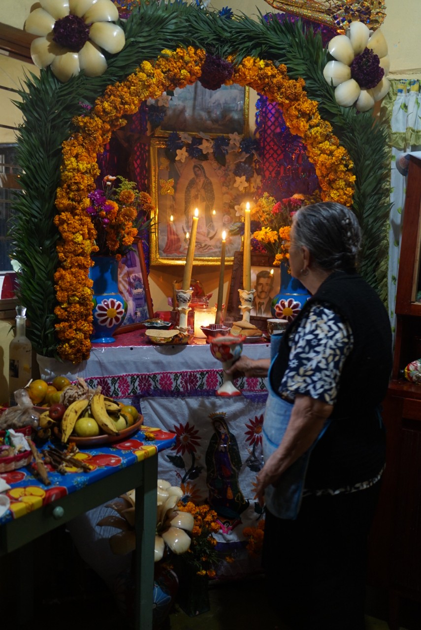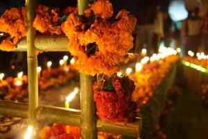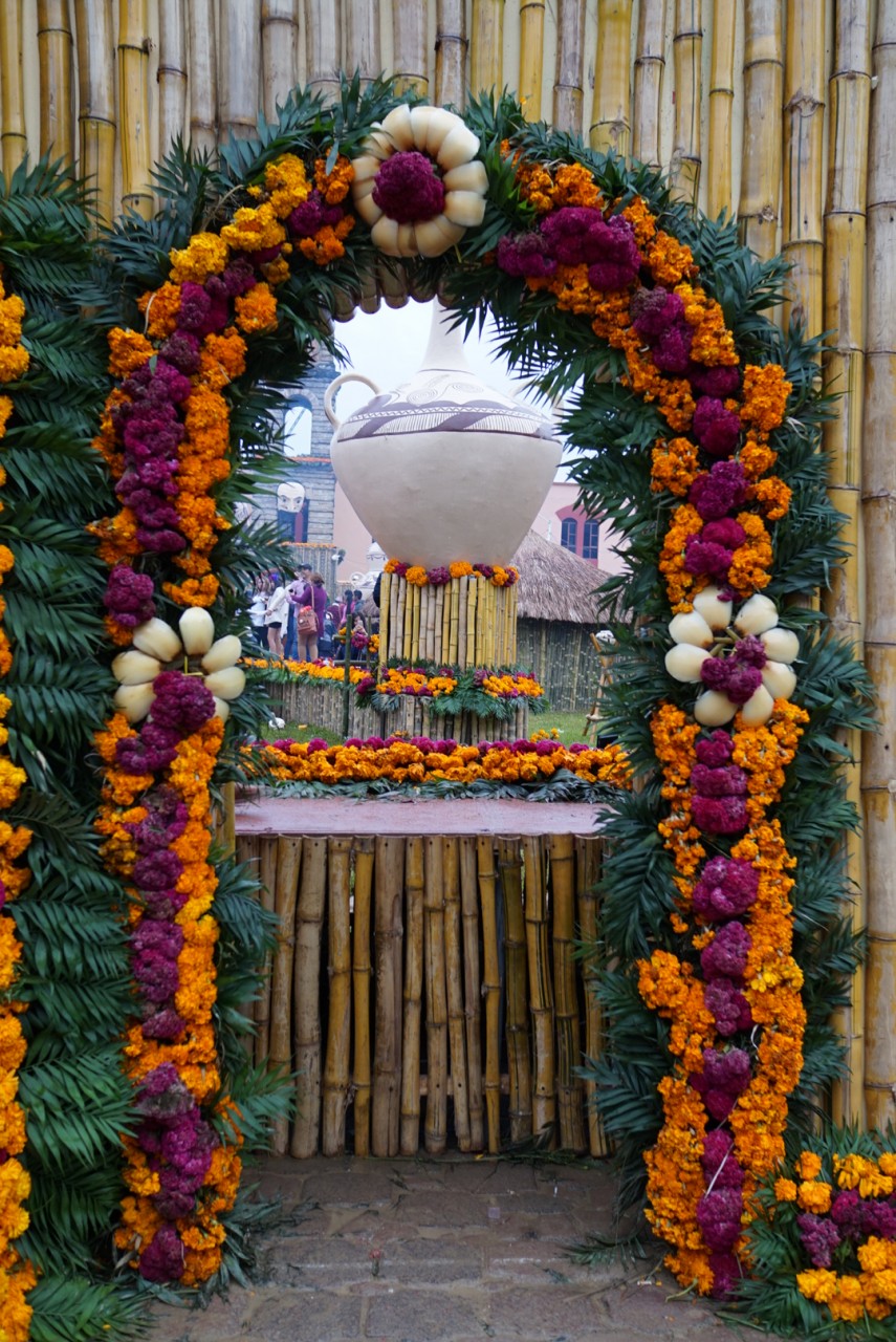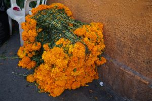 Eine Woche vor den Festivitäten tauchten plötzlich überall wohlriechende orangefarbene Blumen auf – ganze Lastwagen voller Flora verwandelten die Straßen in ein Blumengeschäft. Cempasúchil heißen sie, oder auch Flor de Muertos, sie werden verwendet um Gräber, Wegkreuze und Altäre für die Toten zu schmücken. Auch im Krankenhaus wurde ein Altar in der Eingangshalle erbaut: auf den geschmückten Altären stehen Bilder der Toten, die Blumen sollen ihnen den Weg leiten, genauso wie Räucherstäbchen und Kerzen. Empfangen werden die Seelen mit Leckereien: Süßigkeiten, Pan de Muertos, Wein und ganze Gerichte stehen auf dem Altar bereit.