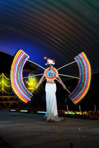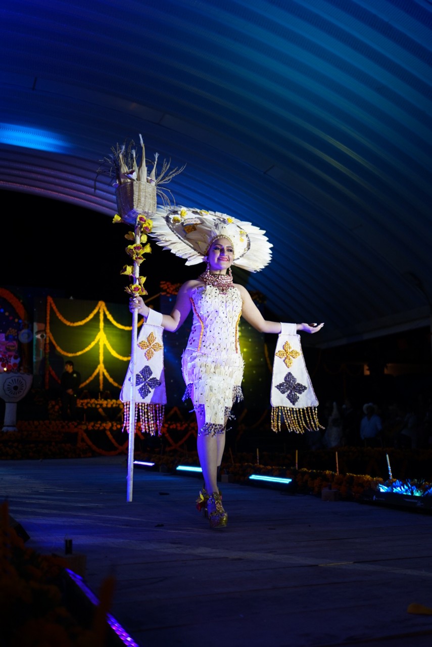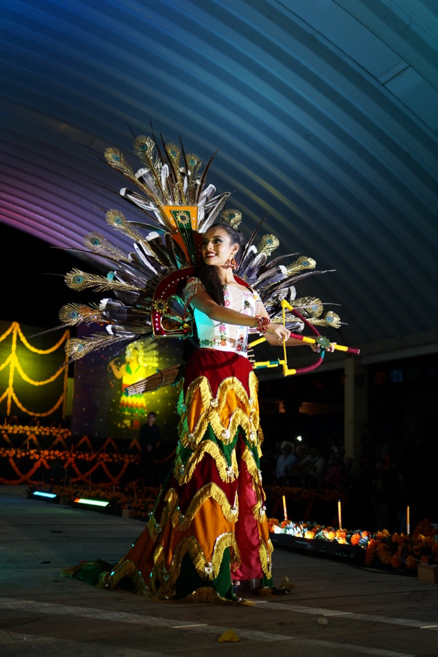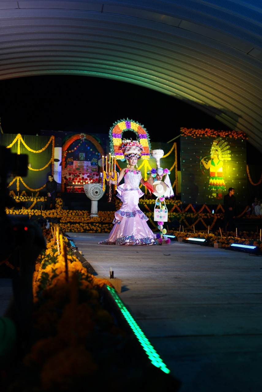 In der zweiten Runde durfte das Publikum augefallene Kostüme bewundern, die die Teilnehmerinnen selber zum Thema Xantolo gebastelt haben. Nun erklärte sich auch, warum Männer auf der ganzen Bühne als Helfer verteilt standen: unter der Last riesiger Kronen und Accessoires bepackt mit brennenden Kerzen und auf High Heels kam die ein oder andere Teilnehmerin ganz schön ins Straucheln. Die Kostüme zeigten Bräuche und Werte des Día de los muertos und wurden nach Kreativität und Individualität bewertet.
