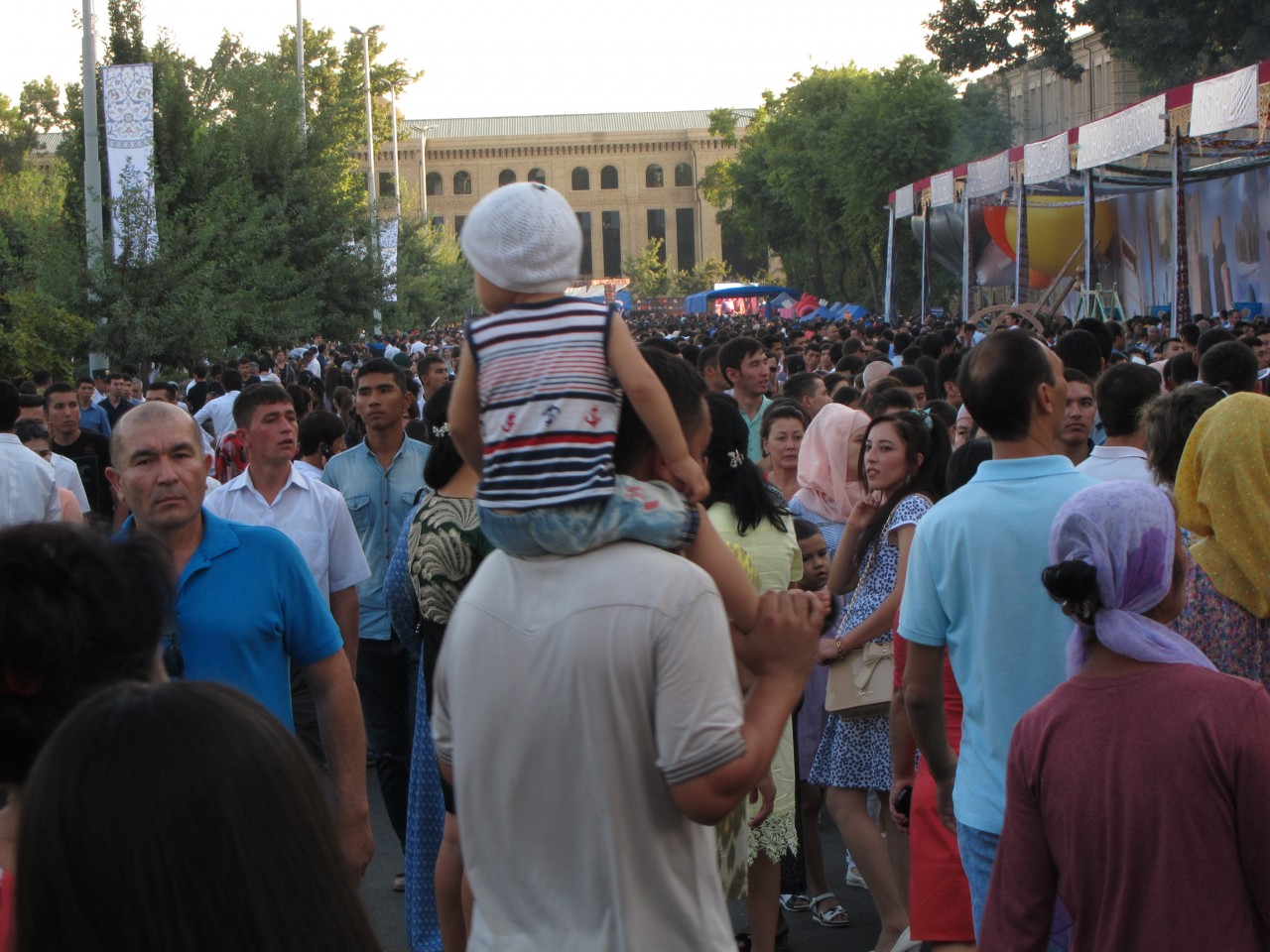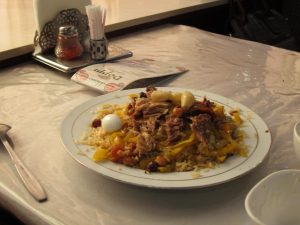 Für besondere Veranstaltungen oder kleinere Ausflüge konnte man sich die Nachmittage aber schon manchmal freischaufeln. Das lustigste Event, das ich in Tashkent besuchen konnte, war auf jeden Fall das Plovfest. Plov, das ist die usbekische Nationalspeise – bestehend aus Reis , der in Öl und Wasser (zu gleichen Teilen) gekocht wird, Kichererbsen, Rosinen, Wachteleiern, Fleisch und diversen Gewürzen. Es ist alles ein bisschen fettig, schmeckt aber super! Im September wurden in der Innenstadt Tashkents sechs Tonnen Plov in riesigen Kesseln auf der Straße zubereitet. Es sollte ein Eintrag im Guinessbuch der Rekorde für den größten Topf gekochten Plovs erreicht werden. 150 Köche waren an dem Kochvorgang beteiligt! Leider konnte man das Kochen vor Ort nur über Leinwände beobachten, denn der direkte Zugang zu den Kesseln war abgesperrt. An jeder Ecke waren noch kleine Bühnen, Hüpfburgen oder Verkaufsstände aufgebaut und es gab viel zu sehen. Es war so voll in der Stadt, dass man schnell den Überblick verlor. Irgendwann brach der Weltrekordsjubel aus, in den ich fröhlich miteinstimmte. Als ich einen Wachmann nach dem Plov fragte, war aber schon alles leer. Ich weiß nicht, wie das bei sechs Tonnen in so kurzer Zeit passieren konnte. Zum Glück ergaben sich noch andere Gelegenheiten, die kulinarische Köstlichkeit zu testen. Plov gibt es nämlich zu jedem Anlass und es steht in jedem Restaurant auf der Speisekarte.