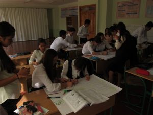 In der Woche war ich jeden Tag etwa zwei Schulstunden ( à 80 Minuten) als Deutschlehrerin im zweiten akademischen Lyzeum beschäftigt. Das Lyzeum ist etwa äquivalent mit unserer Oberstufe – die SchülerInnen besuchen es im Anschluss an neun Jahre Schule für drei Jahre und können mit dem Abschluss an der Universität studieren. Im Lyzeum sieht es ziemlich so aus, wie es auch in einer deutschen Schule aussehen könnte. Da gibt es Chemielabore und lange Flure und auch eine Mensa. Um zwölf Uhr ist täglich Mittagspause, da sprinten die Schülermassen hungrig zur Essensausgabe und man muss in den Gängen gut Acht geben. Das beste Essen ist immer schnell weg, genauso wie Sitzplätze. Zum Glück gibt es für die Lehrer (und Praktikanten) einen kleinen Extraraum. Der Unterricht beginnt morgens um neun. Ich unterrichtete in Schülergruppen aus allen drei Jahrgängen. In der Regel hat jede Gruppe nur einmal pro Woche Deutschunterricht. Nur Gruppe 207 – die Spezialgruppe – hat viermal pro Woche. Gruppe 207 lernte ich daher besonders gut kennen, während ich die anderen SchülerInnen stets nur einmal pro Woche zu Gesicht bekam. Gruppe 207 war mir sehr sympathisch. In der ersten Stunde, als ich um Namensschilder bat, wurde ich gefragt, ob sie sich auch deutsche Namen geben könnten. Dann hießen sie alle Paul, Lisa, Emma und Max, das hat das Namenlernen enorm vereinfacht. Außerdem sagten alle SchülerInnen zu Beginn jeder Stunde selbstständig folgenden Spruch auf: