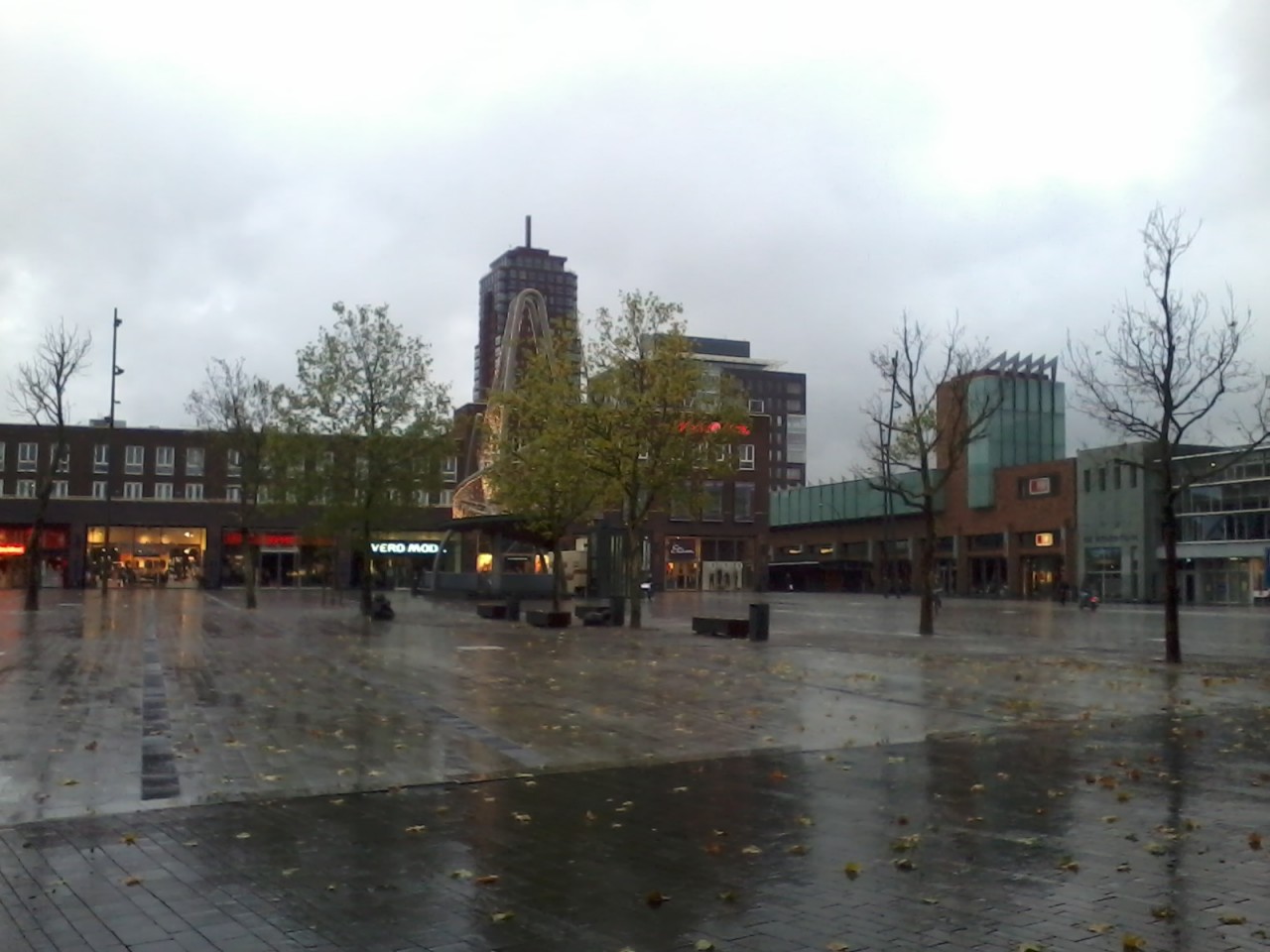 Hier im Vordergrund kann man das sogenannte „Het Ei van Ko“ sehen. Es ist oval, wie das Stadtzentrum von Enschede, und zeigt einen Brunnen und vier bronzene Figuren: Vater, Mutter, Kind und einen Hund. Dies soll eine Familie darstellen. Es wird auch „Het Ei van Ko“ genannt, weil der Künstler seinem Kunstwerk keinen Namen gegeben hatte und die Bürger das eiförmige Gebilde daher nach dem damaligen Bürgermeister Ko Wierenga nannten.