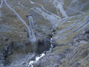 Der Trollstigen ist eines der bekanntesten Touristenziele in Norwegen. Eine Straße mit 12 % Steigung jeweils abwärts und wieder aufwärts und bestehend aus sehr engen Haarnadelkurven. Am besten fährt man ihn tagsüber, da es abends keinerlei Beleuchtung gibt.