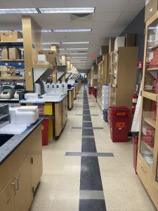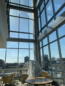 Die Haltestelle der U-Bahn, mit der ich jeden Morgen zur Arbeit fahre, liegt fast direkt gegenüber vom Boston Children’s Hospital, sodass ich mir eigentlich jeden Morgen erstmal in der Cafeteria des Klinikums (zu welchem wir als Labormitarbeiter ebenfalls Zugang haben) einen Kaffee hole. Der Kaffee im Klinikum ist mit 1,54$ für knappe 450ml um einiges billiger als in einem normalen Coffee Shop wie Starbucks oder Cafe Nero und zudem auch noch sehr gut, weshalb die Cafeteria jeden Morgen mein erster Stop ist. Mit meinem Kaffee mache ich mich dann auf den Weg zu unserem Forschungsgebäude, was sich direkt gegenüber des Children’s Hospitals befindet. Unser Labor befindet sich im siebten Stock des zwölfstöckigen Gebäudes; im gleichen Stockwerk gibt es außerdem ein riesiges Atrium mit Glaswänden, von wo man einen super Blick über Longwood hat, dem Stadtteil, in dem sich viele medizinische Institute befinden.