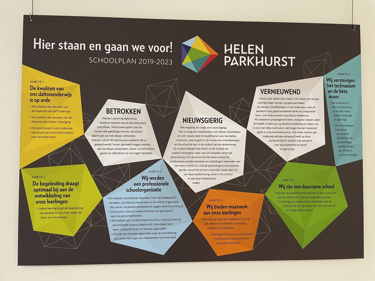 Die Schule unterrichtet nach dem in den Niederlanden sehr verbreiteten Dalton-Plan, welcher in die Richtung der Montessoripädagogik geht. Nach dem Dalton-Konzept sollte auf Frontalunterricht verzichtet und der Lernstoff von den SchülerInnen selbstständig angeeignet werden. An der Helen Parkhurst werden diese Grundsätze leicht modifiziert, aber es sind deutliche Merkmale dieses pädagogischen Ansatzes zu erkennen. Eine typische Unterrichtstunde beginnt hier mit einer kurzen Einführung durch die Lehrkraft, darauf folgt eine Arbeitsphase, häufig in Partner- oder Gruppenarbeit, mit mehreren Wahlmöglichkeiten. Am Ende reflektieren die SchülerInnen ihre getane Arbeit. Oft wird an Wochenplänen oder an anderen Langzeitaufgaben gearbeitet, damit die SchülerInnen ihren Lernprozess selbst organisieren können. Mir ist sehr positiv aufgefallen, dass an der Schule viel auf jeden Schüler und jede Schülerin individuell eingegangen wird. So hat jede/r sechs Mal im Schuljahr ein Gespräch mit dem/ der jeweiligen KlassenlehrerIn, in dem eigens aufgestellte Lernziele und deren Erreichung besprochen werden. Im Gegensatz zu den meisten deutschen Schulen ist diese auf dem technisch neusten Stand. Vom digitalen Klassenbuch, über funktionierende (!) Smartboards und Kaffeeautomaten an fast jeder Ecke ist hier alles verfügbar. Allerdings ist das alles nur mit einer nicht geringen Menge an Schulgeld, die von den Eltern gezahlt werden muss, zu finanzieren.