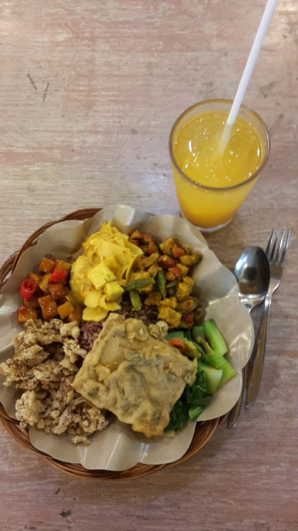 In Indonesien wird fast gar nicht daheim, sondern an den vielen Essensständen an der Straße gegessen. Es gibt Hünchen, Fisch, aber auch Gemüse, Tofu und Tempeh (mit Hefe fermentierte Sojabohnen) und natürlich mie (Nudeln) oder nasi (Reis). Alles sehr lecker und für deutsche Verhältnisse sehr, sehr preiswert. Eine Portion Essen kostet zwischen 12. – 15.000 Rupia. Das sind umgerechnet 70 – 90 Cent. Man hat also oft ein volles Portemonnaie und dennoch wenig Geld.