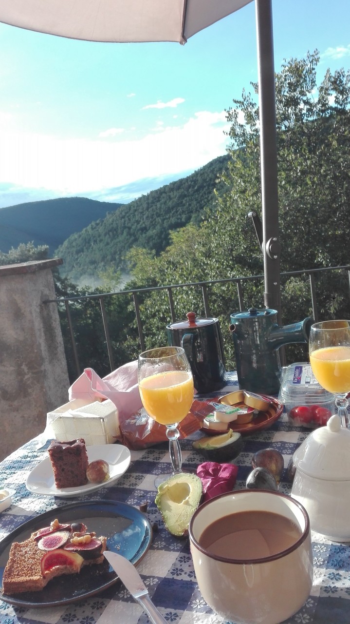 Und in den Bergen bei Sadernes ganz in der Nähe, haben wir ein wunderschönes Airbnb gefunden mit einer Terasse, von der aus man einen Blick über die bewaldeten Berge hat.