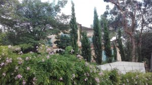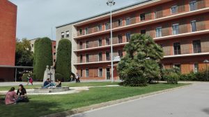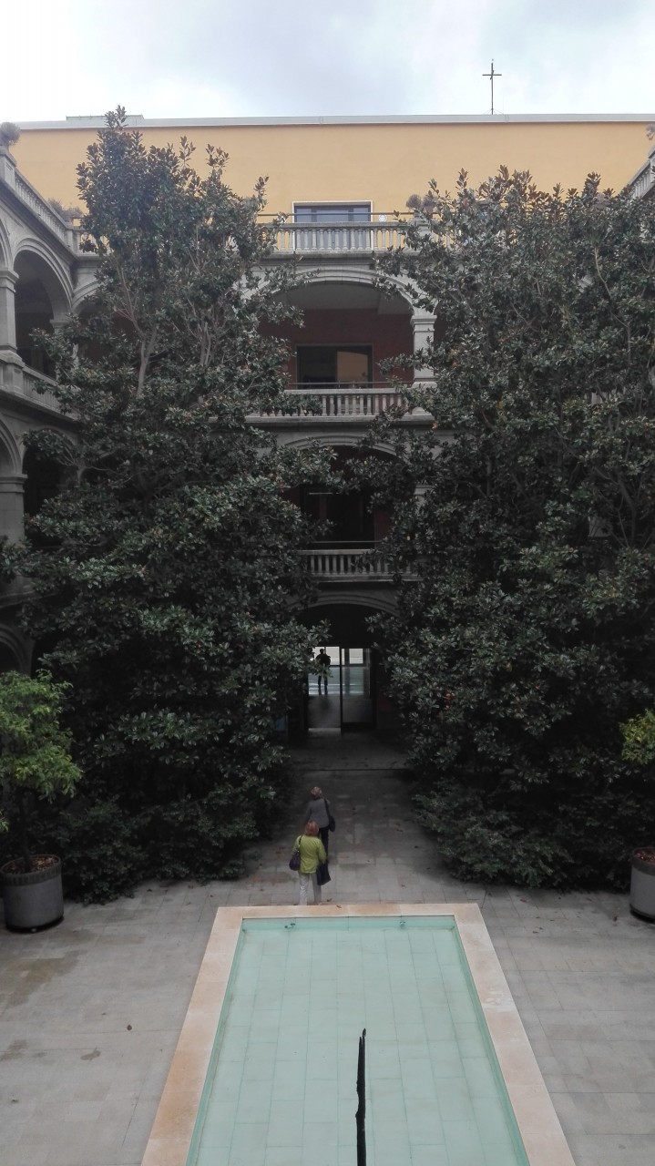 Daneben befinden sich eine Kirche, ein großer Platz und ein Brunnen. Der Campus Mundet erinnert fast an ein Bergdorf. Der Campus ist voller Pinien, Palmen und Grasflächen und ich komme oft früher, um ein bisschen der Hektik des Zentrums zu entfliehen und mit einem Kaffee auf der Terrasse der Cafeteria die Sonne zu genießen. Auch der Innenhof des Gebäudes ist sehr schön und hat ein Wasserbecken.
