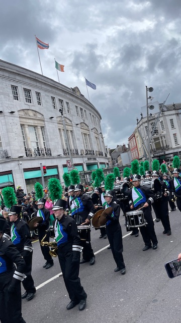 Und so sind wir am Sonntag (16.03.) morgen nach Limerick aufgebrochen, um uns die Parade des International Band Championships anzuschauen. Nach einem Kaffee ging es zur Strecke, insbesondere Familien mit kleinen Kindern, alle mit grünen Accessoires verkleidet, standen an der Strecke. Eine Musikgruppe nach der anderen zog an uns vorbei, dabei größtenteils Blaskapellen, aber auch Dudelsackspieler und begleitende Tanzgruppen waren dabei. Die Gruppen kamen aus Irland, Nordirland und den USA. Später entdeckten wir etwas weiter eine Tribüne. Vor dieser Bühne hielten die einzelnen Gruppen an und führten etwas vor einer Jury von drei Personen auf. Nach dieser Parade versammelten sich alle Gruppen am Arthurs Quay. Das ist ein großer Platz nahe der Innenstadt. Dort wurde weiter musiziert, bis die Gewinner unterschiedlichster Preise verkündet wurden. Allgemein war gute Stimmung, das Wetter hat auch mitgespielt und es war sehr schön, so viel Livemusik zu hören!