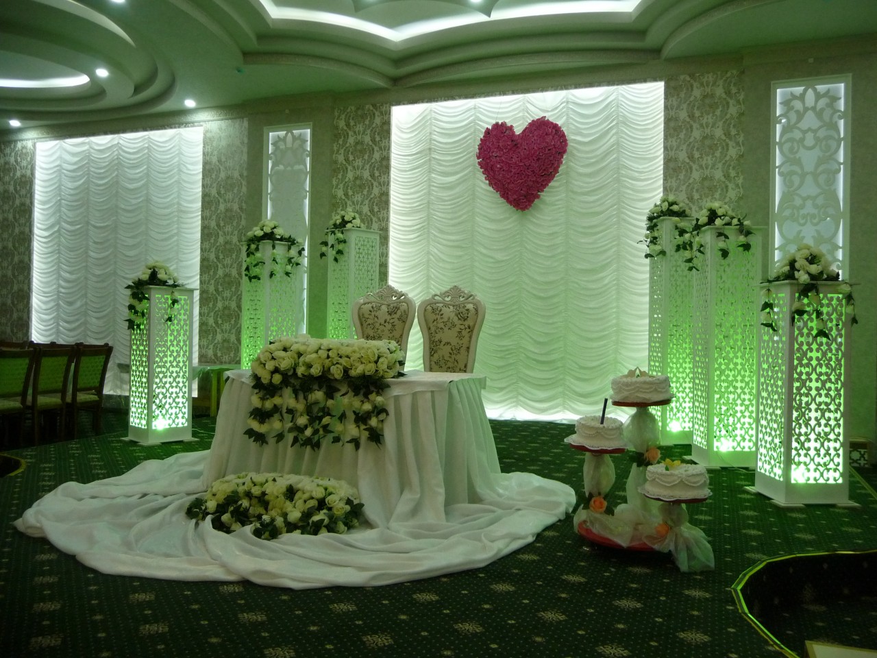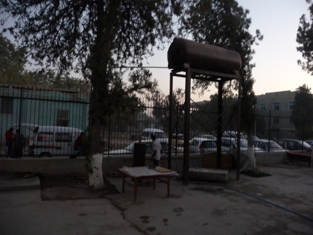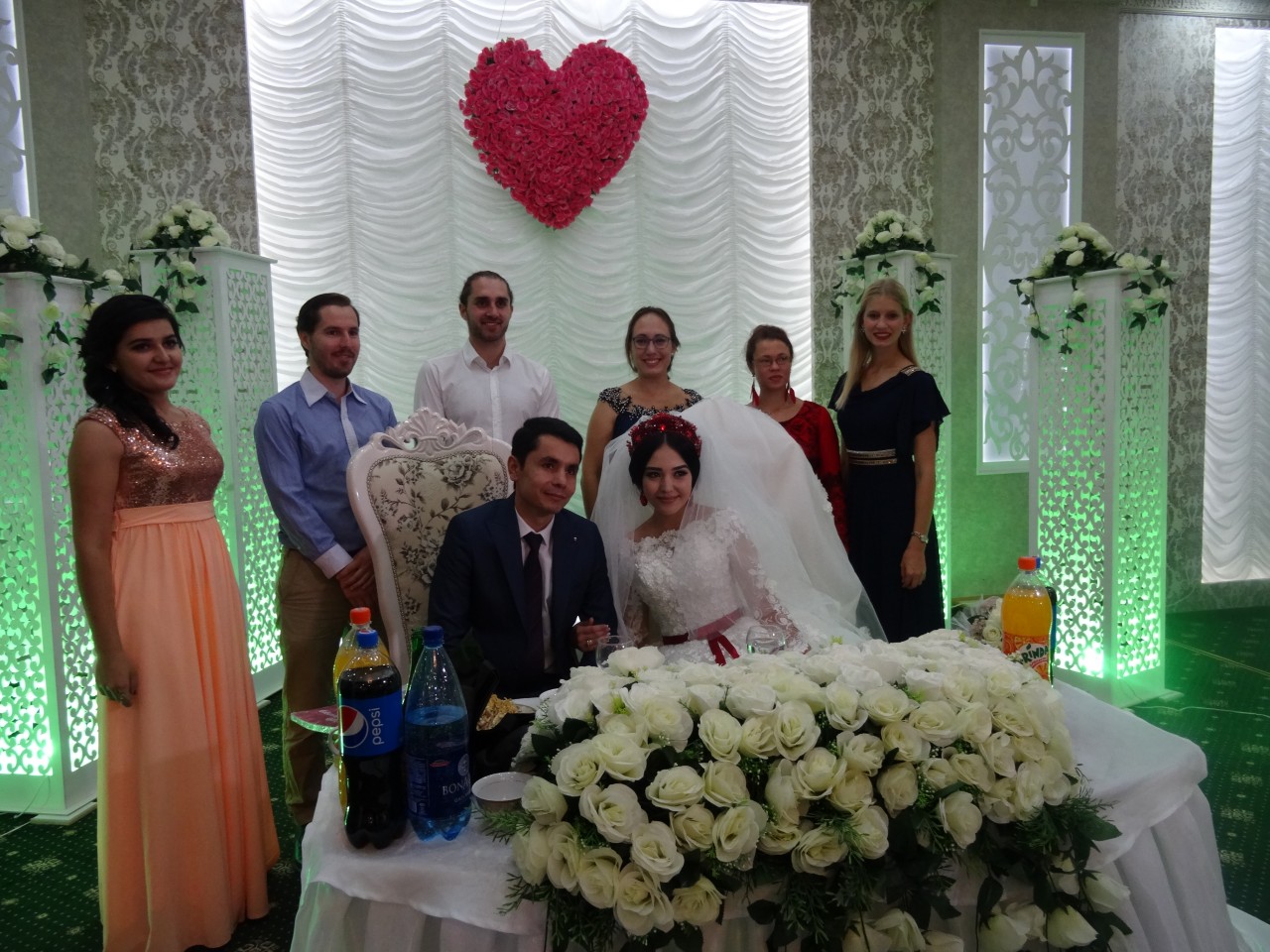 LAUFEN??! — Über die usbekischen Transportmittel habe ich zum Teil ja schon berichtet (ja, wer meint, ein Blogeintrag reiche dafür, hat sich gründlich geirrt! Ich habe noch nicht vom Flugzeug erzählt, nicht vom Esel, nicht vom Damas-Kleinbus), aber den generellen Zustand der Fußwege dabei außen vor gelassen: Schlaglöcher von bis zu fünf Zentimeter Tiefe, zu 70 Prozent mit losem Gestein bedeckt, drapiert mit einer leichten bis mitteldicken Schicht aus Staub und Sand beschreiben den durchschnittlichen Gehweg ganz gut. 50 Meter davon schaffe ich auch mit Highheels, aber einen Kilometer?! Ich springe also, nachdem ich das Hippodromkleid übergeworfen habe, wieder in meine Wanderschuhe und bepacke eine „Studentenwerk Münster“-Tasche mit Highheels und Fotokamera. Tatsächlich schaffen wir es alle, halbwegs wohlriechend und ansehnlich pünktlich im Hof unserer wunderschönen Herberge zu stehen. Zu unserer großen Erleichterung wurde umdisponiert und zumindest die Damen werden nun doch gefahren, sodass die Wanderschuhe wieder ins Zimmer kommen und wir sogar zehn Minuten zu früh an der großen Hochzeitshalle „Glückliche Familie“ ankommen. Da es für uns alle die erste und vermutlich letzte usbekische Hochzeit ist, sind wir sehr gespannt. Nachdem wir zahlreiche Fotos von unseren Outfits und dem Interieur geschossen, die Hochzeitstorte und den überdimensionalen Warmwasserbehälter für den Tee bewundert und einen Plausch mit den Küchendamen gehalten haben, werden wir doch nervös. Es ist mittlerweile 18:45 Uhr und wir sind immer noch die einzigen Gäste im Raum. Etwas falsch verstanden haben wir aber nicht, wie Hafiza bestätigt. Verzögerungen sind anscheinend bei usbekischen genauso üblich wie bei deutschen.