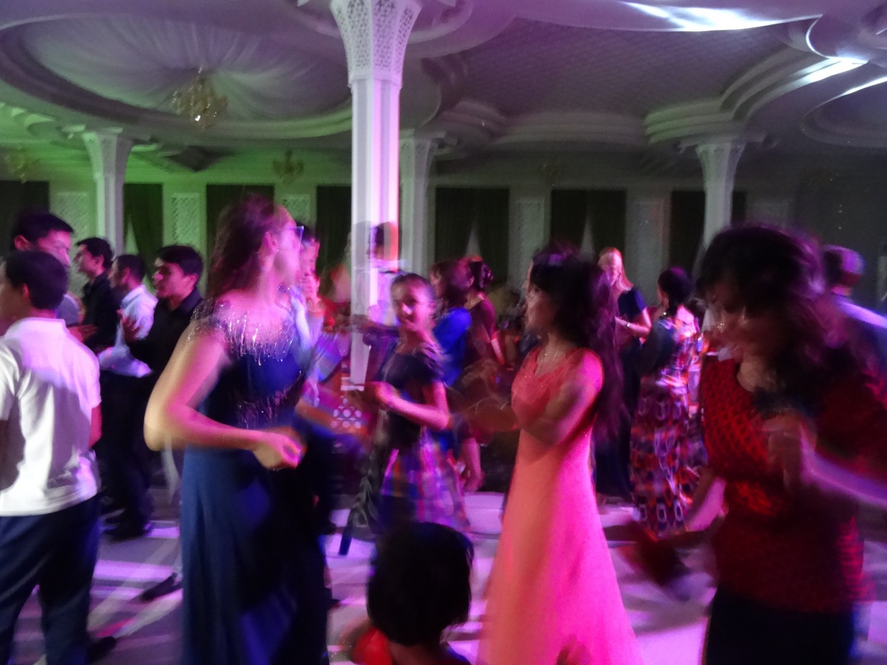 Um 19:30 Uhr ist es dann endlich soweit, die Halle hat sich gefüllt und zu einem Song, dessen Text uns mit „Braut kommt, Braut kommt“ übersetzt wird, zieht das Hochzeitspaar ein. Auf dem Weg nach vorn muss sich die Braut dabei alle paar Meter vor diversen Menschen verbeugen. Damit wir nicht völlig irritiert sind, wurde uns bereits vorab erklärt, dass die Braut am Hochzeitstag ob des Abschieds von ihrer Familie traditionell Demut zur Schau stellen muss. Dazu legt sie die rechte Hand aufs Herz und schlägt die Augen nieder. Mein Foto unten ist also ein absoluter Schnappschuss, auf dem die Braut ihre Neugierde auf die ausländischen Gäste ihres Mannes nicht verbergen kann. 🙂 Die restliche Zeit über steht das Paar aber tatsächlich ziemlich steif und nicht besonders glücklich dreinschauend vorne, wird von Gästen für Fotos belagert und kommt auch deshalb nicht zum Essen, weil die Speisen vor ihnen schnell unter Tausendsumscheinen begraben sind, während alle anderen beim ersten Lied direkt auf die Tanzfläche stürmen. Als wir uns nach einiger Zeit trauen, unseren Eindruck, dass auf der Hochzeit offenbar alle so richtig Spaß haben, nur das Brautpaar nicht, einer Usbekin mitzuteilen, grinst sie und bestätigt: „Das ist normal. Die eigene Hochzeit ist nie die Beste!“