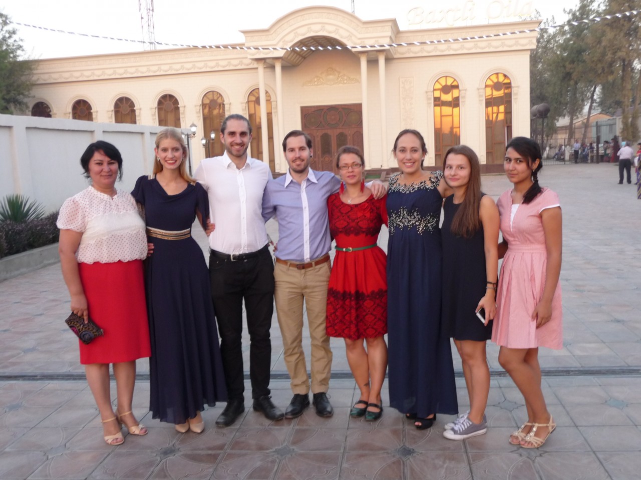 Aus den 45 Minuten wurden dann leider nur zehn: Als wir gegen 17:10 Uhr in Schachrisabs ankamen, empfing uns unsere Ansprechpartnerin Hafiza, eine Übersetzerin, deren Namen wir im Laufe unseres weiteren Aufenthalts tatsächlich in zahlreichen deutschsprachigen Publikationen usbekischer Literatur gefunden haben, bereits sehr aufgewühlt, weil wir um 17:30 Uhr zur Hochzeit loslaufen sollten.