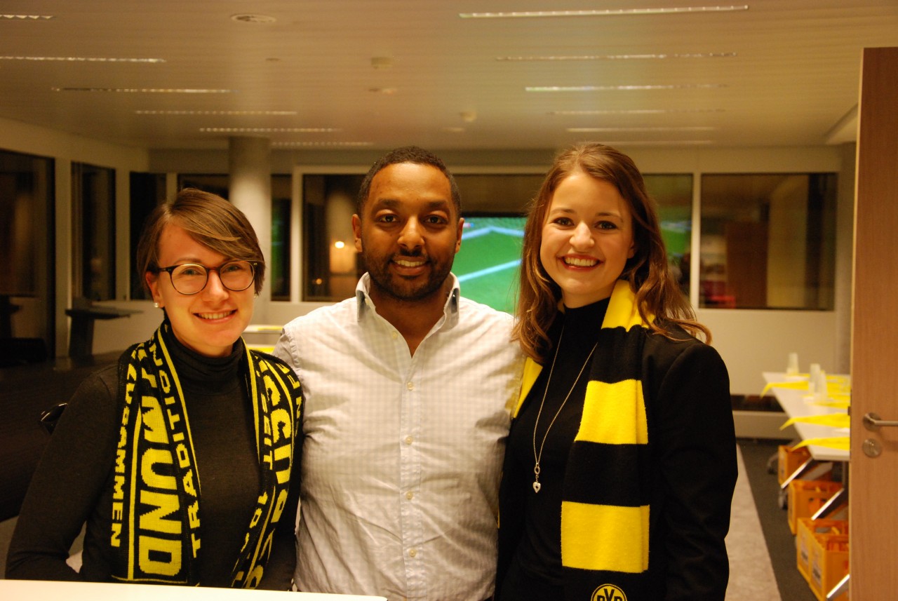Diese Fragen beschäftigten mich vom ersten Tag an. Um meine alten Schulkenntnisse über die EU ein bisschen aufzupolieren, musste ich mich erst einmal in eine ganze Menge Literatur einlesen. Überwältigt von den vielen Abkürzungen und Begriffen, hat es mir sehr geholfen, mich mit meinen Bürokollegen auszutauschen, die gute Einblicke in den Brüsseler Alltag haben. Unser Büro ist mit aktuell 9 Leuten gut überschaubar (verglichen mit einigen anderen Chemieunternehmen und Verbänden aber relativ stark besetzt, habe ich mir sagen lassen), wodurch sich jeder einbringen kann. Mit drei weiteren Junior Referenten und drei festenReferenten stellen wir also ein ausgewogenes Team dar. Regelmäßig finden Meetings, Workshops und Veranstaltungen statt bei denen ich mit anpacken kann und durch die ich mich fest im Team integriert fühle. So konnten wir im November 2017 zum Beispiel ein „BVB vs. Tottenham“-Spielviewing veranstalten.