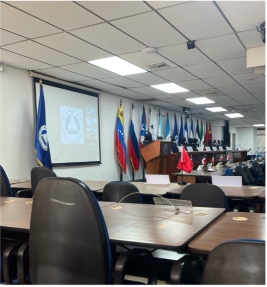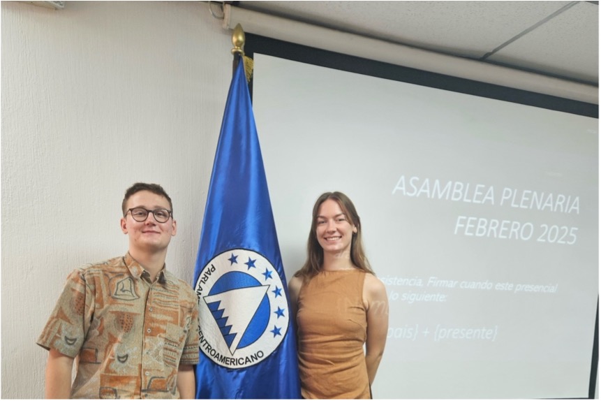 Am 25. Februar 2025 um 9 Uhr nehmen Matthias und ich im Plenarsaal des PARLACEN in Guatemala-Stadt Platz. Der Plenarsaal ist lang, rechteckig und eng bestuhlt. Es sitzen erst wenige Abgeordnete auf ihren Plätzen, und der Raum wird noch vorbereitet. Namensschilder und Nationalflaggen werden gerade auf den Tischen platziert. Vorne befindet sich ein Podest für den Vorstand des Parlaments, die Junta Directiva. Dahinter hängen diverse Flaggen, unter anderem die der sechs Mitgliedsstaaten: Guatemala, El Salvador, Panama, Nicaragua, die Dominikanische Republik und Honduras.