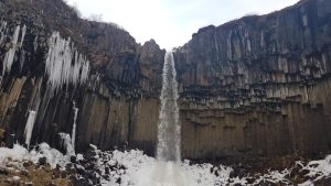Ein weiterer Wasserfall, bei dem sich ein Zwischenstopp (trotz 750 ISK Parkgebühr) lohnt, ist der Svartifoss, der in einem wunderschönen Camping- und Wandergebiet in einer Kurve etwa eine halbe Stunde vor der Gletscherlagune Jökulsárlón liegt. In diesem Gebiet gibt es tolle Wanderwege mit vielen Aussichtspunkten über die weiten Lavafelder der Gegend.