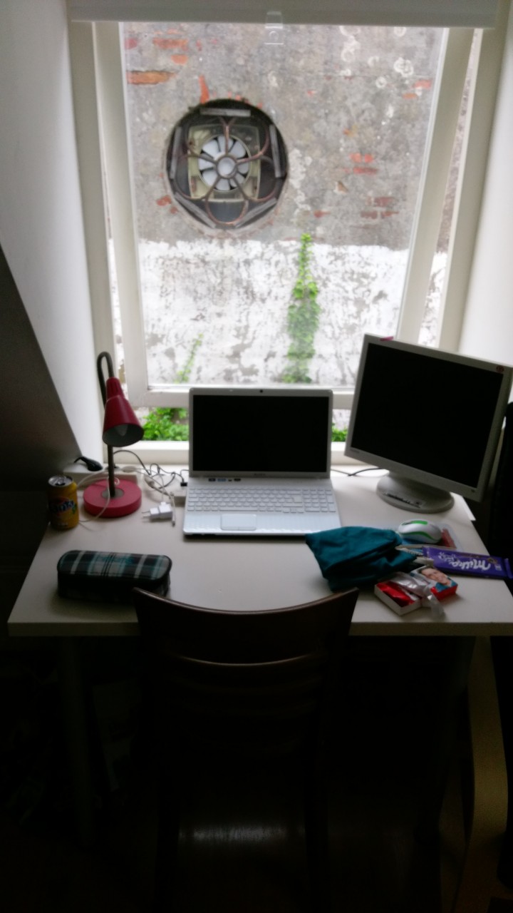 nes Dachgeschosszimmer mit zwei Fenstern was eigentlich ziemlich schön hell ist. Der Blick vom Schreibtischfenster ist allerdings etwas – naja – sagen wir mal karg. Und vorallem die Treppe hinauf ist etwas anders, als ich es aus Deutschland kenne, denn die Steigung entspricht eher einer Leiter und dies hat besonders beim Einzug für einige Probleme gesorgt, aber mir wurde versichert, dass das für alte holländische Häuser genauso normal ist wie unser charmantes Duschklo. Duschklo? Ja genau, es handelt sich um einen kleinen Raum, in dem sich ein Klo, ein Duschhahn und im Boden ein Abfluss befindet. Kein Waschbecken, nichts. Bei drei Mädels im Haus ist somit eigentlich der Boden durchs Duschen immer nass, erste Anschaffung hier waren also ein paar schicke Badelatschen.
