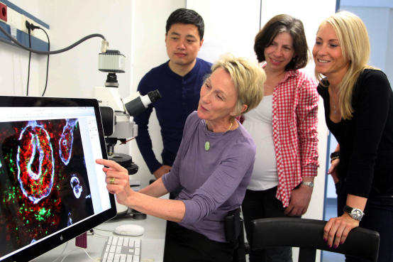 Erste Varianten des Stoffs werden dann in der Arbeitsgruppe von Lydia Sorokin, hier von Dr. Eva Korpos, an Gewebeschnitten angewendet und überprüft.© CiM - Elisabeth Deiters-Keul
