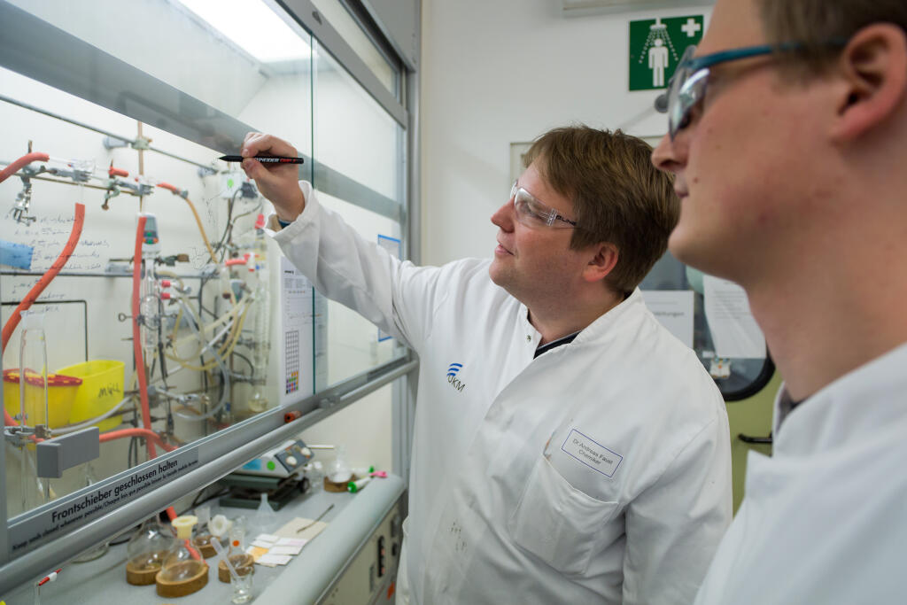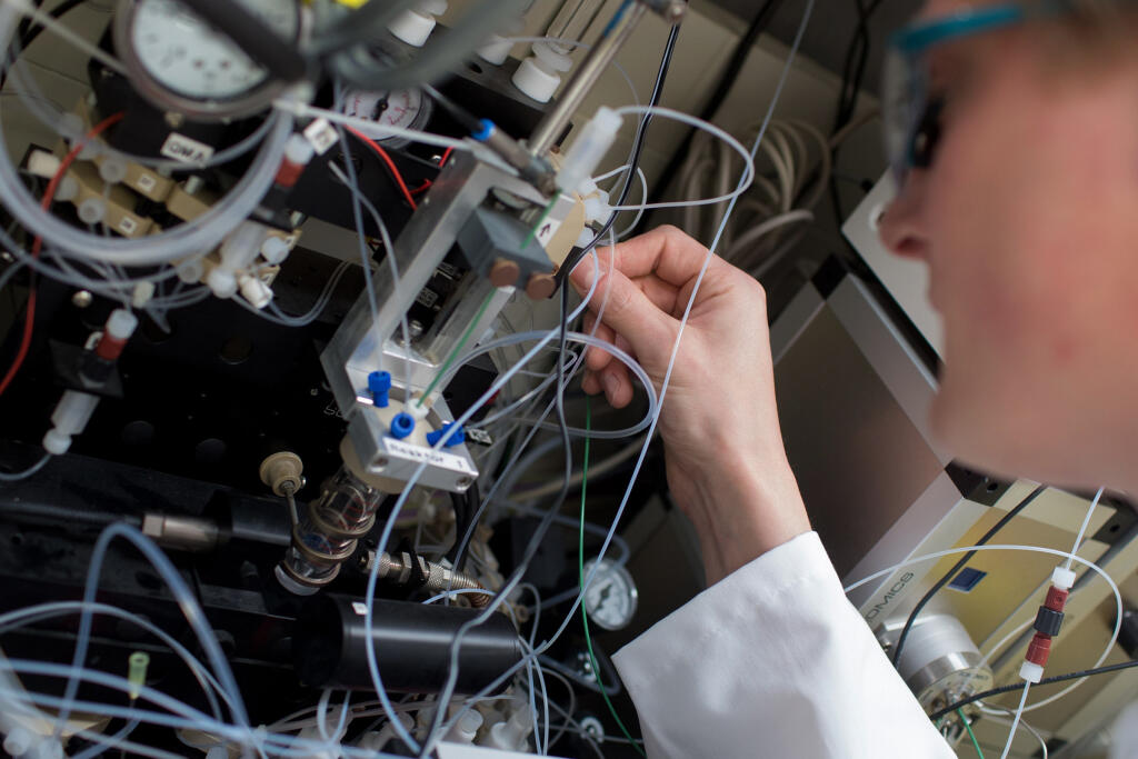 Damit die Tracersubstanz, der Spürstoff, im Organismus sichtbar gemacht werden kann, koppelt Felix Busch eine schwache Dosis einer radioaktiven Substanz daran.© SFB 656 - Peter Leßmann
