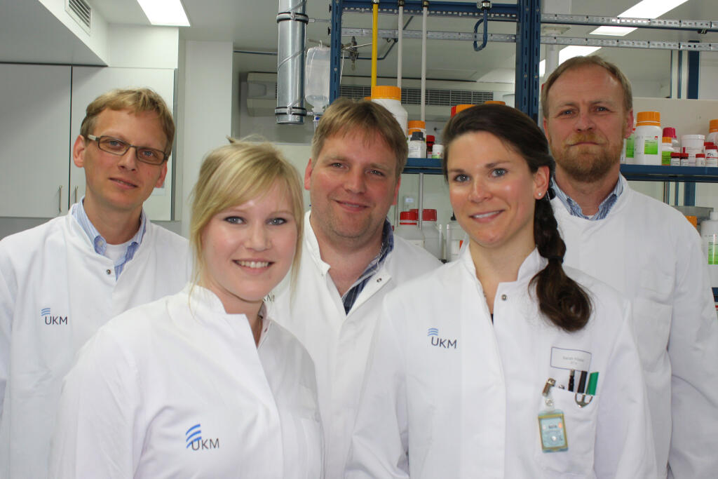 Durch die Weiterentwicklung des Spürstoffs erhofft sich das Team um Dr. Sven Hermann, Dr. Andreas Faust und Dr. Thomas Vogl (v. l. n. r.), das Risiko einschätzen zu können, ob eine entzündete Gefäßwand aufzureißen droht.© SFB 656 - Frieda Berg