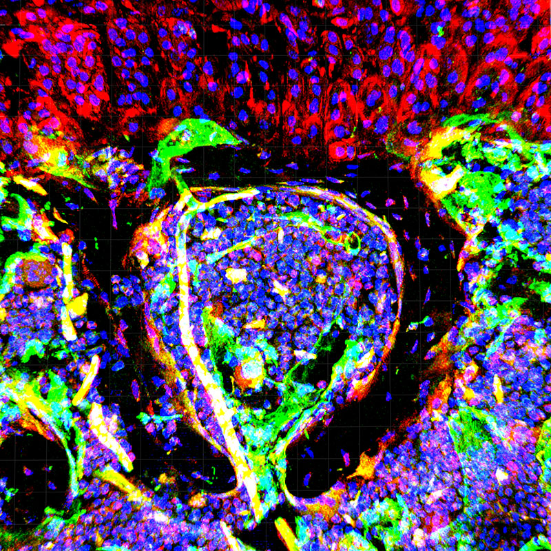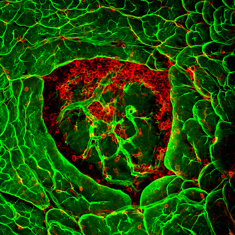 In diabetes, insulin-producing cells of the pancreas are destroyed by a chronic inflammation. This image shows immune cells (red) penetrating the basement membrane (green) of insulin-producing cells. Confocal microscopy© Eva Korpos, Lydia Sorokin