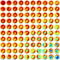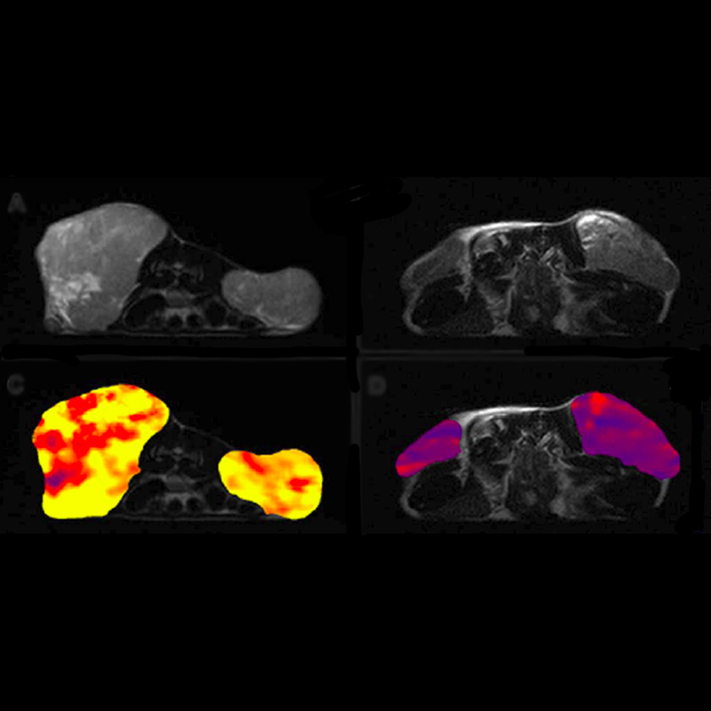 Morphology of two tumours (top) and their vascular perfusion (bottom). The left panel shows well-perfused tumours (yellow/red). In response to a new vessel-blocking therapy, perfusion of the tumours is significantly lowered (right, blue/violet). MRI© Thorsten Persigehl, Wolfgang Berdel