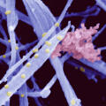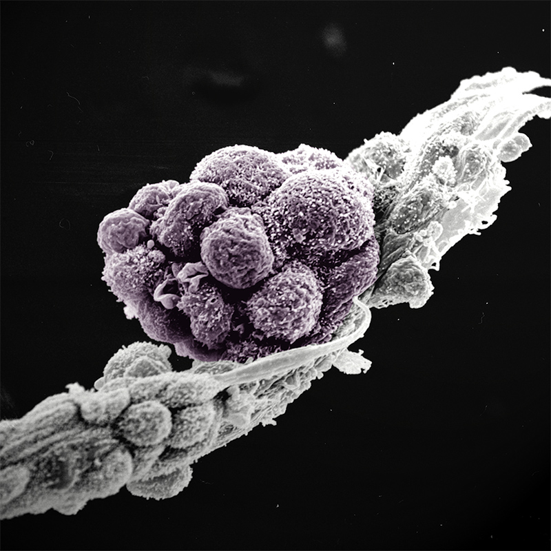 An early germ cell colony (violet) generated from stem cells. This image shows the tight cell-cell contacts between the germ cells, as well as between the germ cells and neighbouring cells (grey). Scanning electron microscopy© Katherina Psathaki, Hans Schöler
