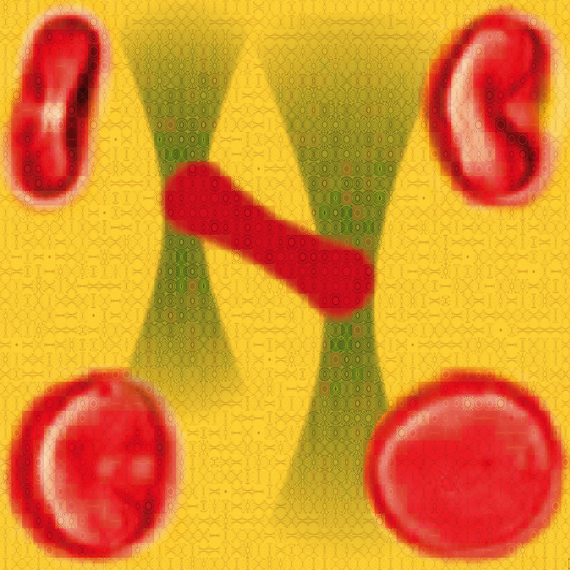 Analysis of blood cell dynamics: Two focussed laser beams trap a single red blood cell (middle). Using this principle, a single cell can be maneuvered and rotated very precisely (depicted in the four corners). “Optical tweezers”© Mike Wördemann, Cornelia Denz