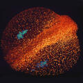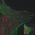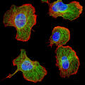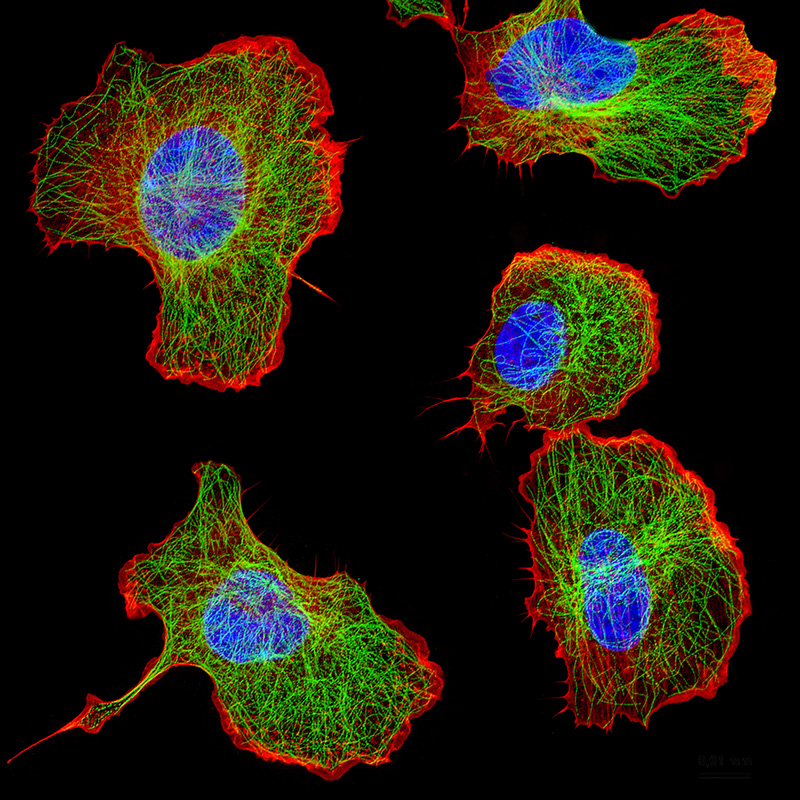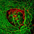 These immune cells respond to a stimulus; they redistribute part of their cytoskeleton (red) to the right. The central portion of the cytoskeleton (green) aligns along the direction of cell migration. Immunofluorescence microscopy© Marc Wolf, Johannes Roth