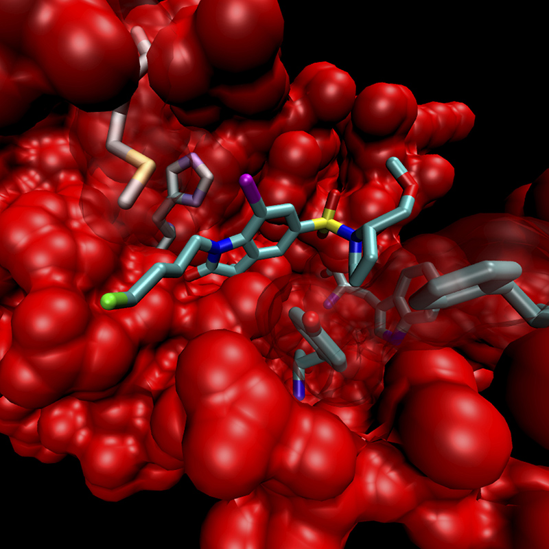 This image illustrates binding of a chemical substance (tracer) to enzymes which are upregulated in inflamed tissues. The green moiety of the tracer is radioactive, which permits imaging. X-ray crystallography analysis© Mark Waller, Panupun Limpachayaporn, Klaus Kopka, Günter Haufe
