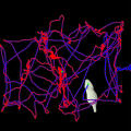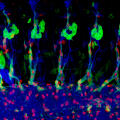 This image shows the peripheral nervous system of a fruit fly (Drosophila). Nerve cells are stained in blue, the surrounding glial cells in green and their cell nuclei in red. Confocal microscopy© Marion Silies, Christian Klämbt