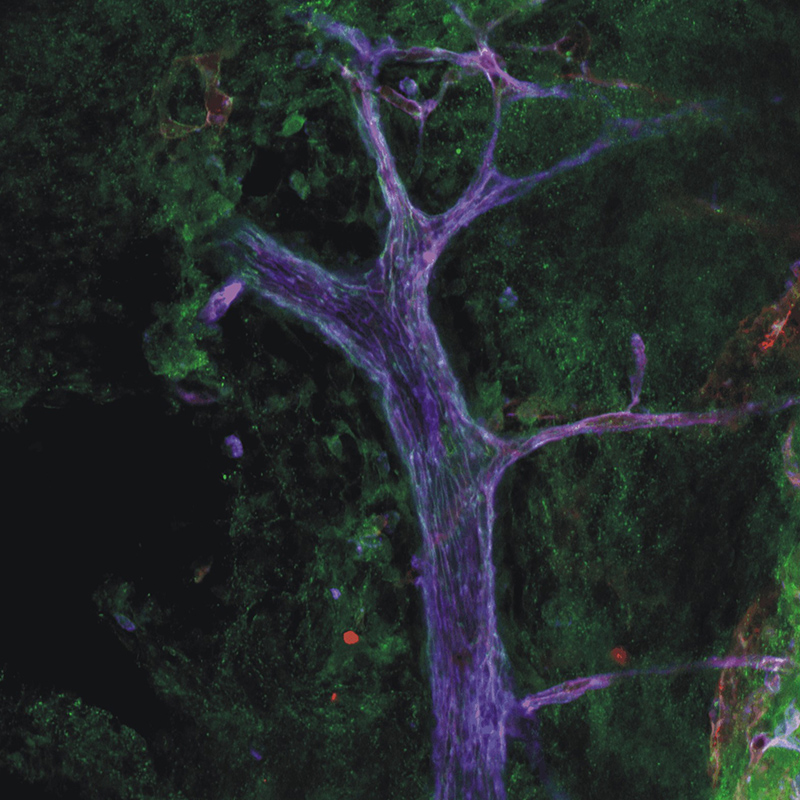 Blood vessels consist of a layer of endothelial cells (green) and a basement membrane (violet). When recognizing inflammation, immune cells (red) exit the blood vessel and migrate to the inflamed tissue. Immunofluorescence microscopy© Hang Li, Stefan Butz, Dietmar Vestweber