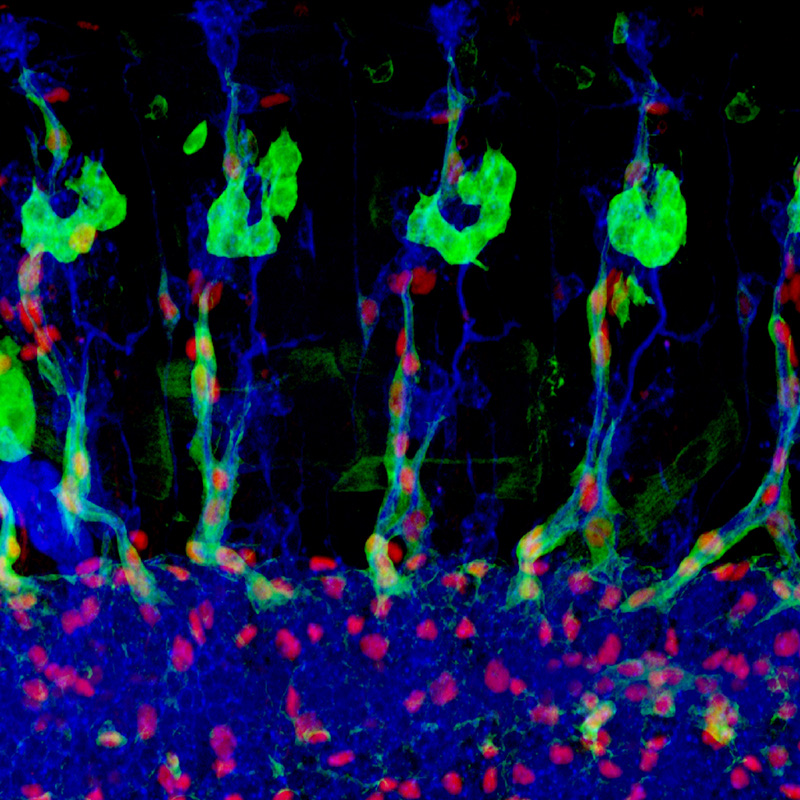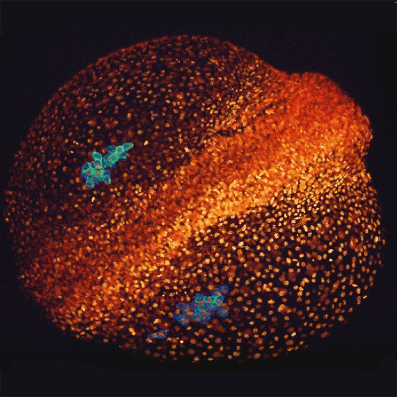 Fluorescently tagged proteins can be expressed in living cells, where they help scientists investigate cellular function. Here, the membranes of zebrafish germ cells express a green fluorescent protein, while nuclei express a blue one. 2-photon microscopy© Azadeh Paksa, Nadine Peyriéras, Erez Raz