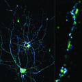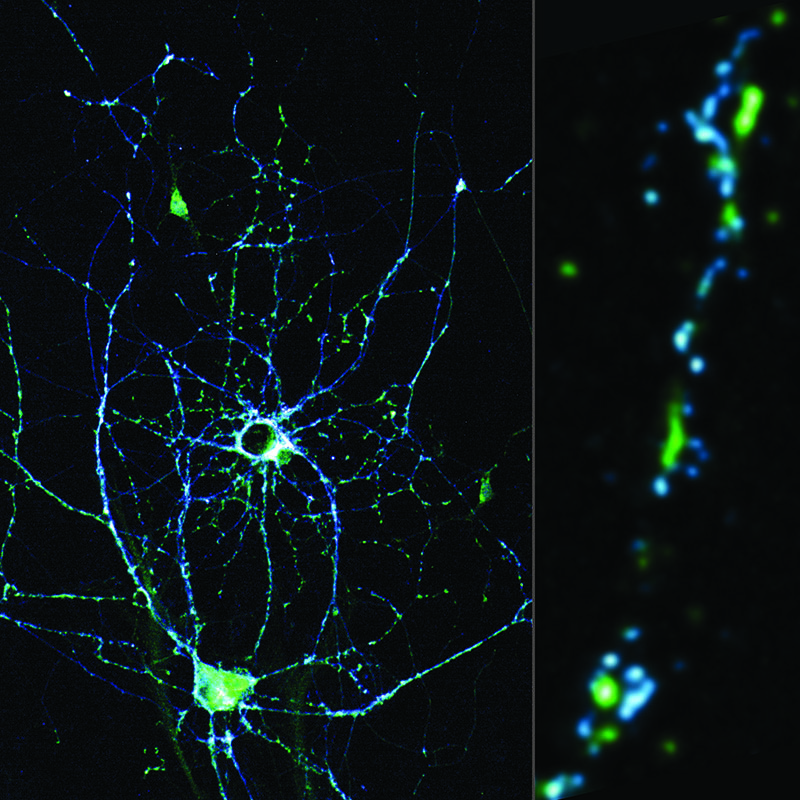 Synapses are the contact and communication interfaces between nerve cells. Innovative microscopy (STED) uniquely visualises the distribution of synapse proteins at a resolution of a few nanometres. © Cora Thiel, Roman Schmid, Jürgen Klingauf
