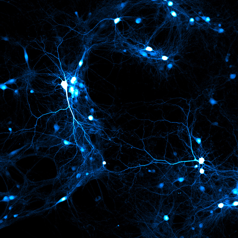 Nerve cells from the hippocampus, an area in the brain which is essential for learning and memory. Each individual cell measures only 1/100 of a millimetre. They form large networks by establishing tight contacts. Confocal microscopy© Frank Erdmann, Hans-Christian Pape